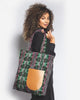 This Sustainable Tote is made exclusively from upcycled woven fabrics (deadstock) and made in Los Angeles. The leather is made in a small tannery in the USA. Each bag is hand-cut and sewn one at a time by talented craftspeople who value quality and longevity.  10% of all sales go to the Haitian Health Foundation.
